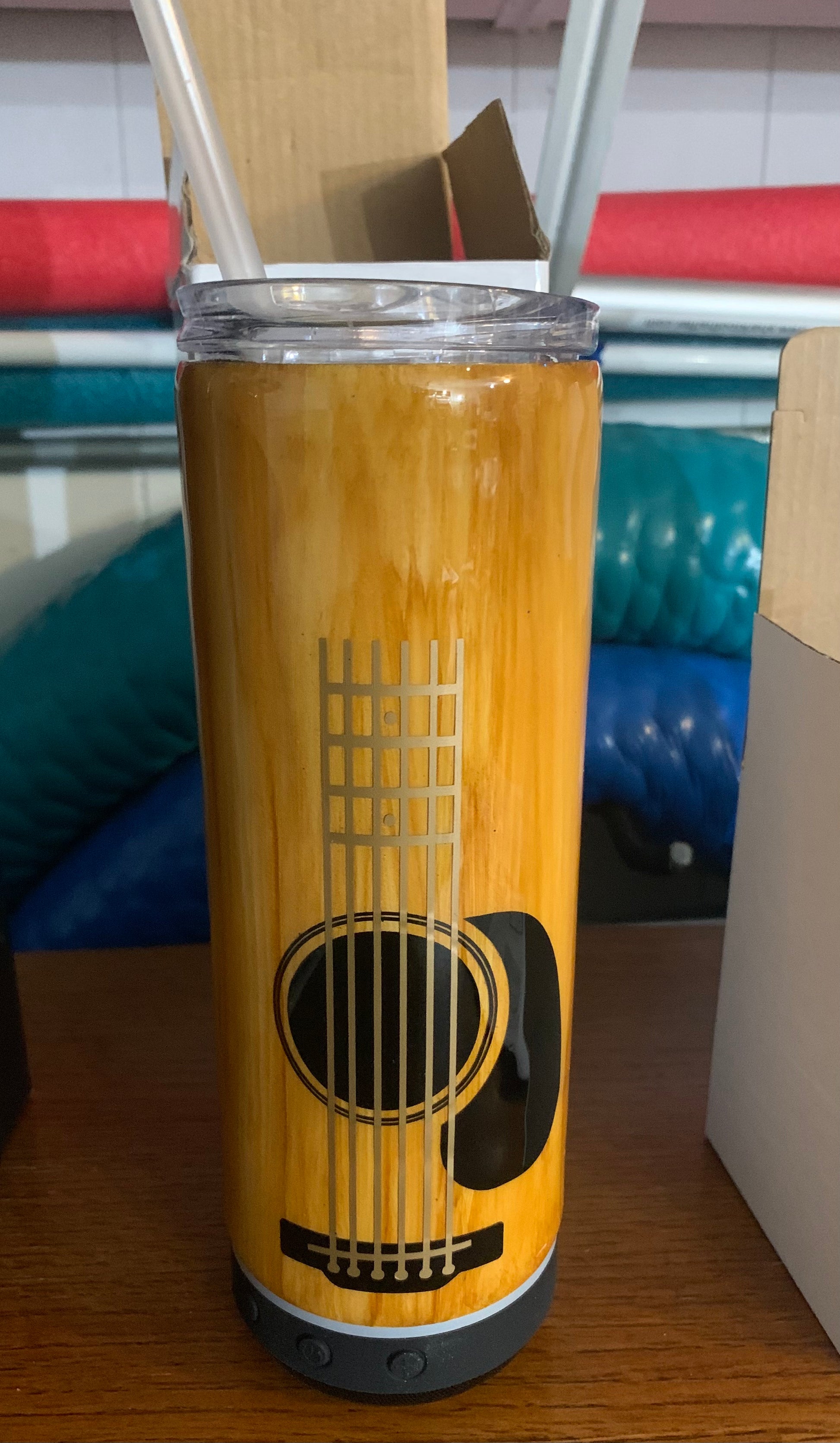 Keep your drink cold and your music hot with this acoustic guitar tumbler! With built-in speakers and a guitar body, you can jam out on the go like a true rock legend. Party like a star, on the road or in the comfort of your own living room!
