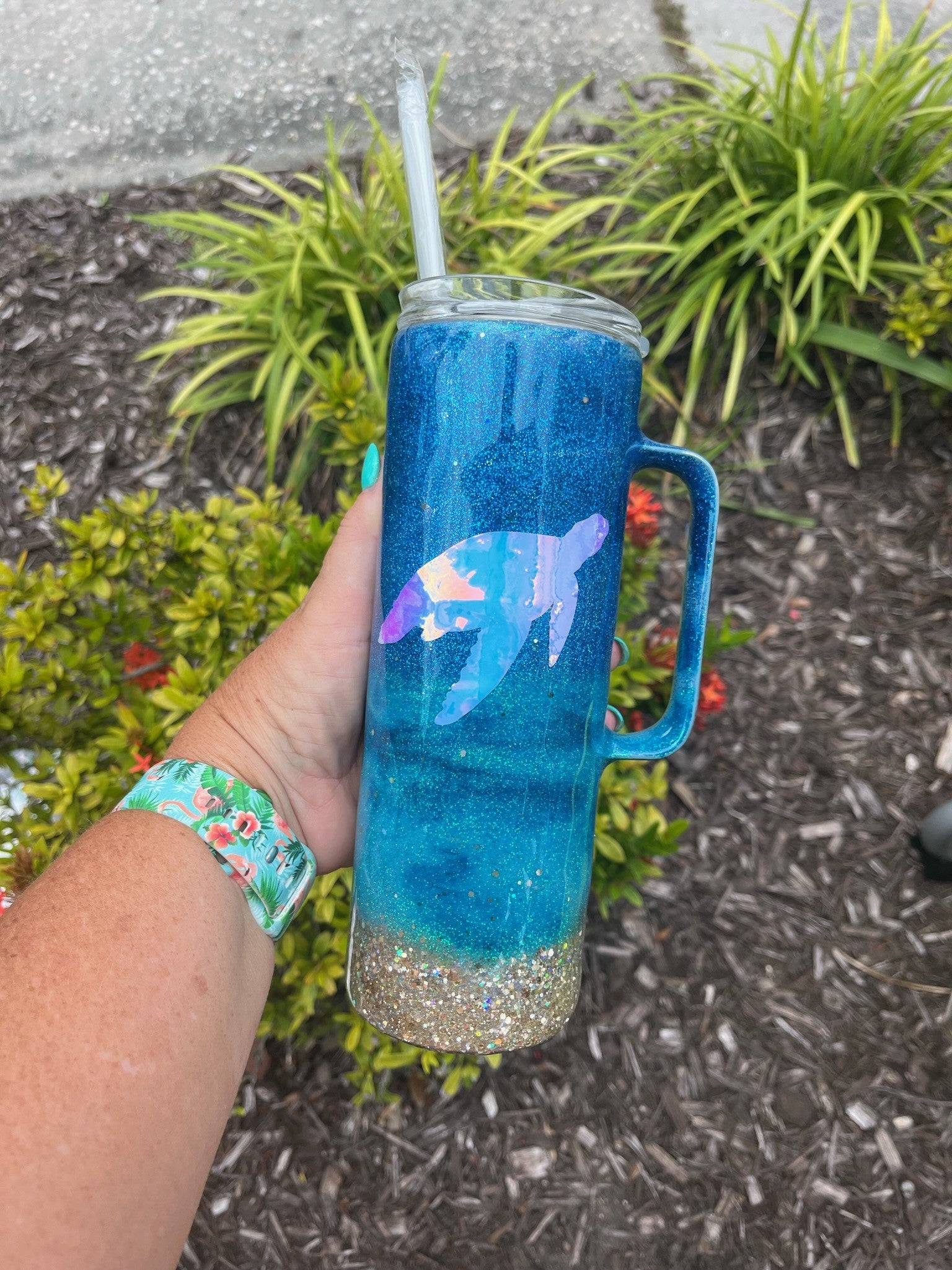 Make a splash at the beach with our holographic turtle glitter epoxy tumbler! Perfect for keeping your drinks cool and adding a touch of whimsy to your day. Sip in style with this fun and quirky cup. (Turtle-y awesome!)