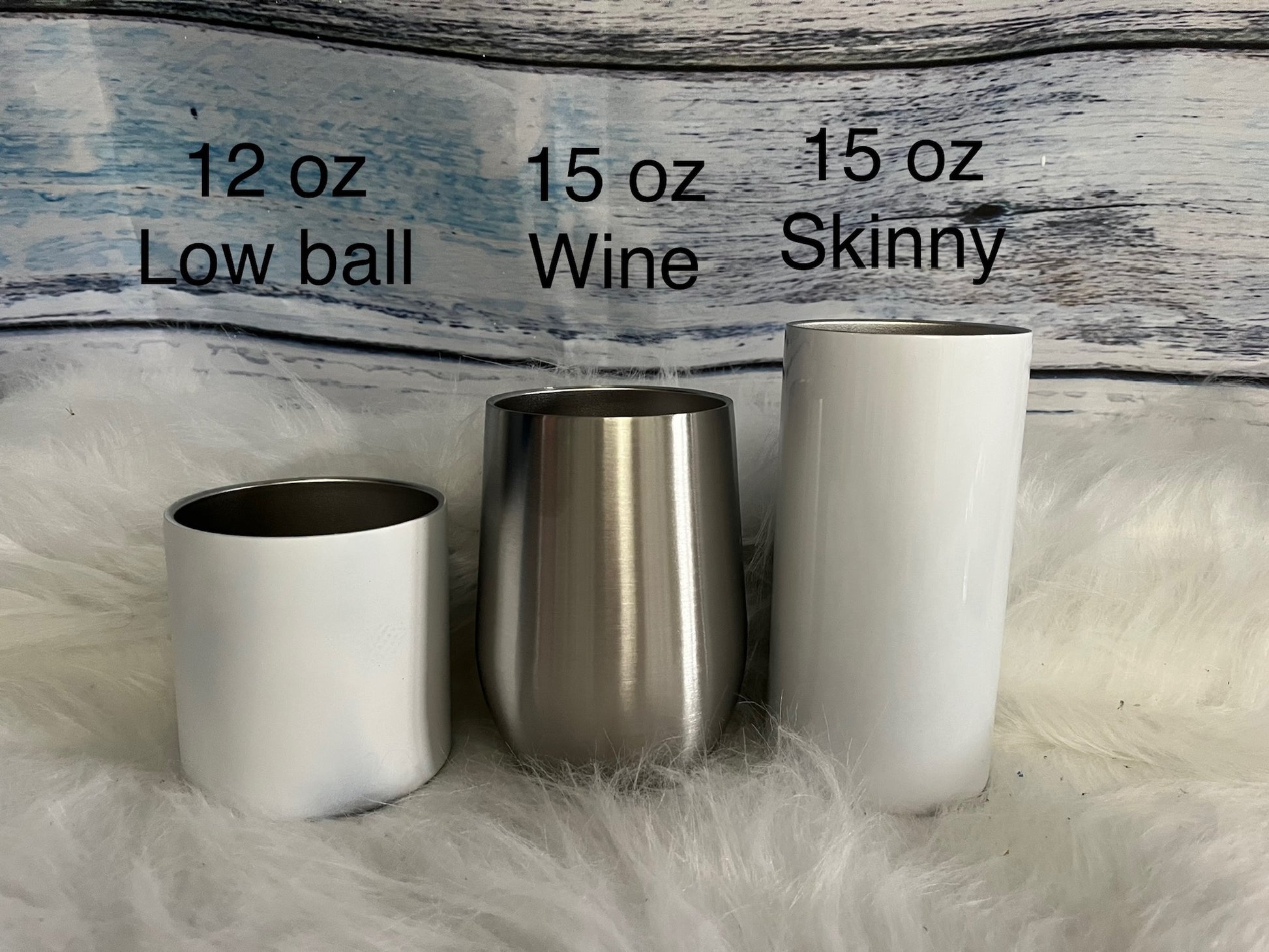 Available in 12 oz. low ball(shown), 15 oz skinny or 14 oz wine cup.