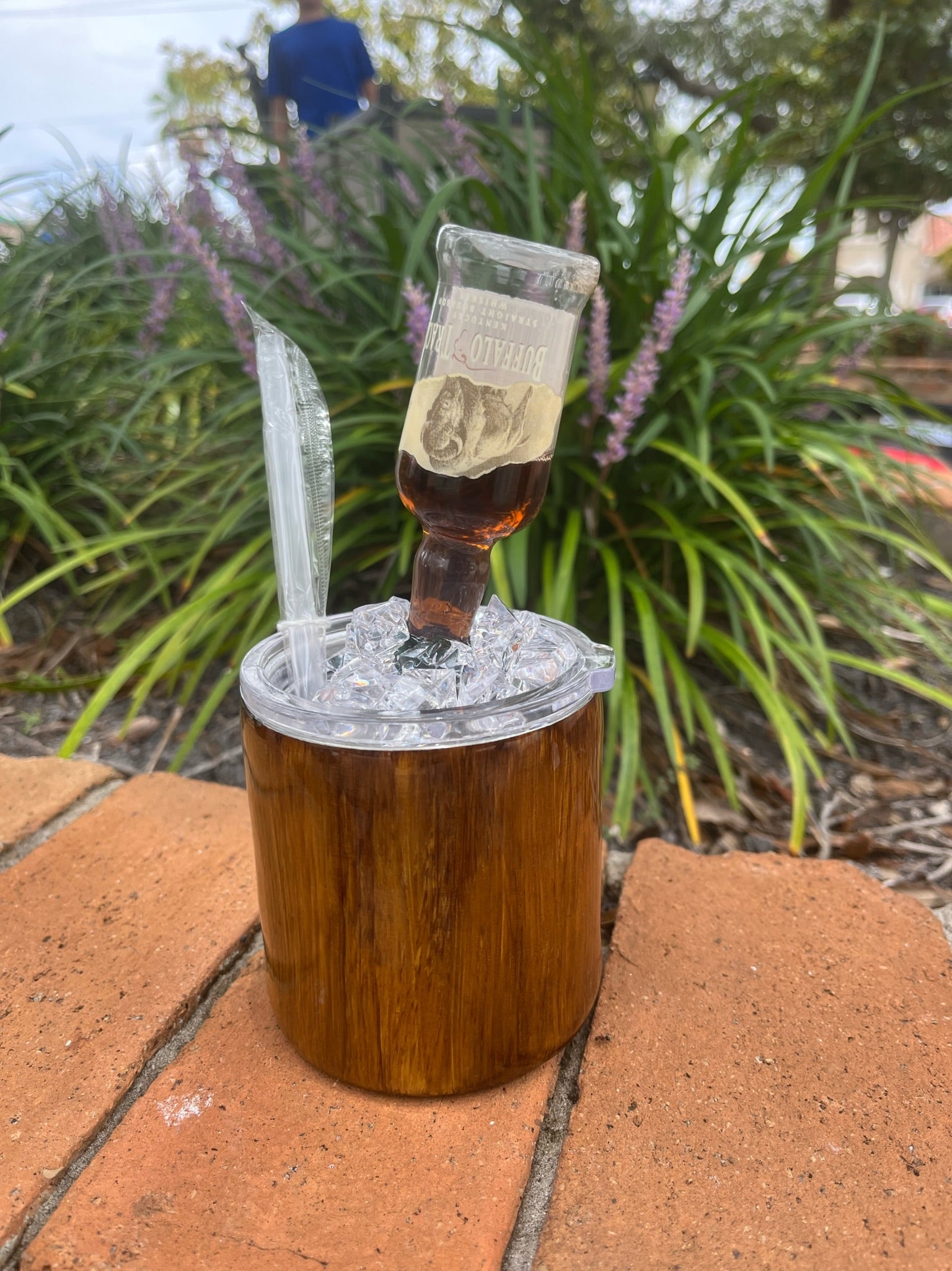 This tumbler takes your drink to the next level with ice and a Buffalo Trace whiskey mini bottle on top! Great for taking to a party or to display on your bar. (Mini bottle contains colored water.)
