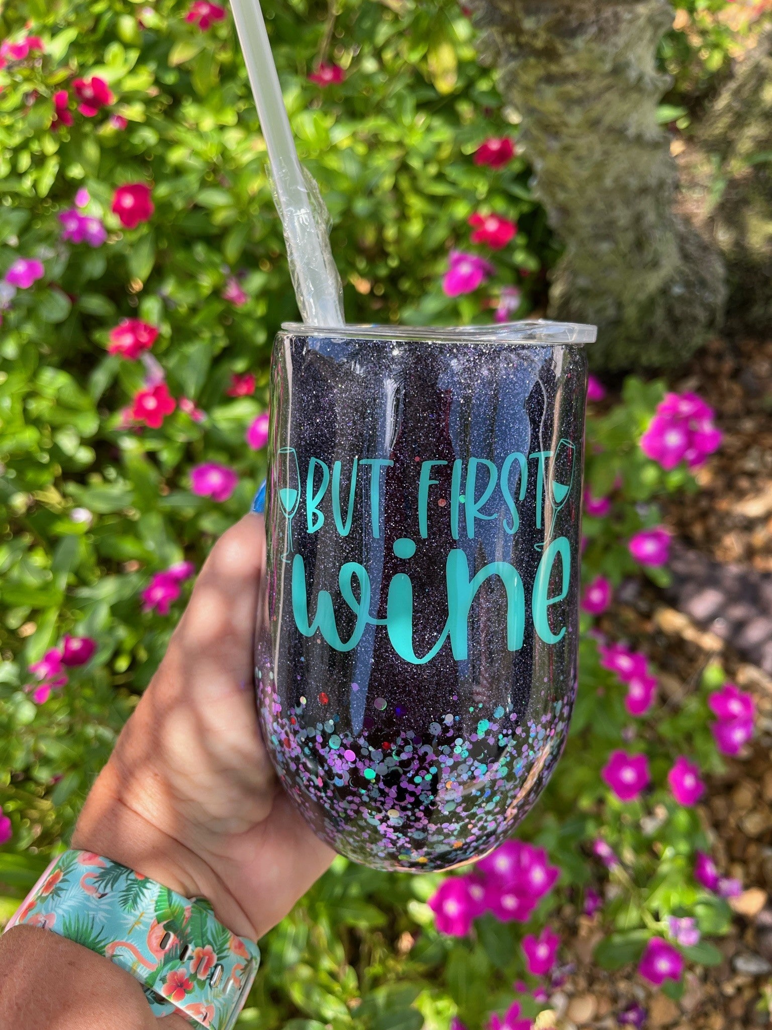 Sip your favorite wine in style with this But First Wine Glitter Epoxy Tumbler. Made with durable epoxy and sparkling glitter, it's perfect for keeping your drink at the right temperature while adding a touch of glamour. Cheers to you and your love for wine! (Is it wine o'clock yet? 🍷)