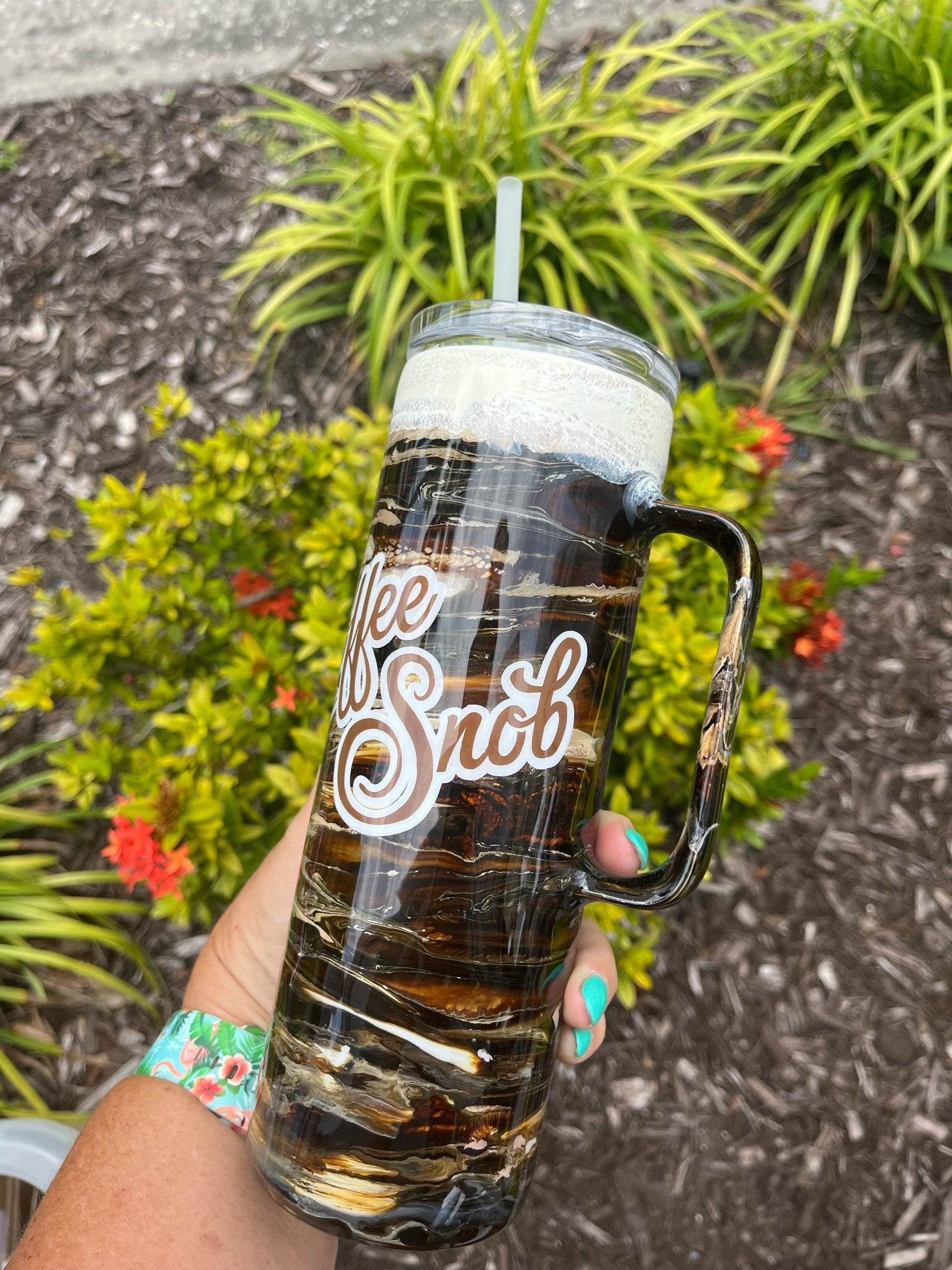 Get your caffeine fix in style with our Coffee Snob epoxy tumbler, complete with a comfortable handle for all-day sipping. Perfect for any self-proclaimed coffee connoisseur, this tumbler keeps your favorite brew at the perfect temperature for hours. Say goodbye to lukewarm coffee and hello to Instagram-worthy sips!