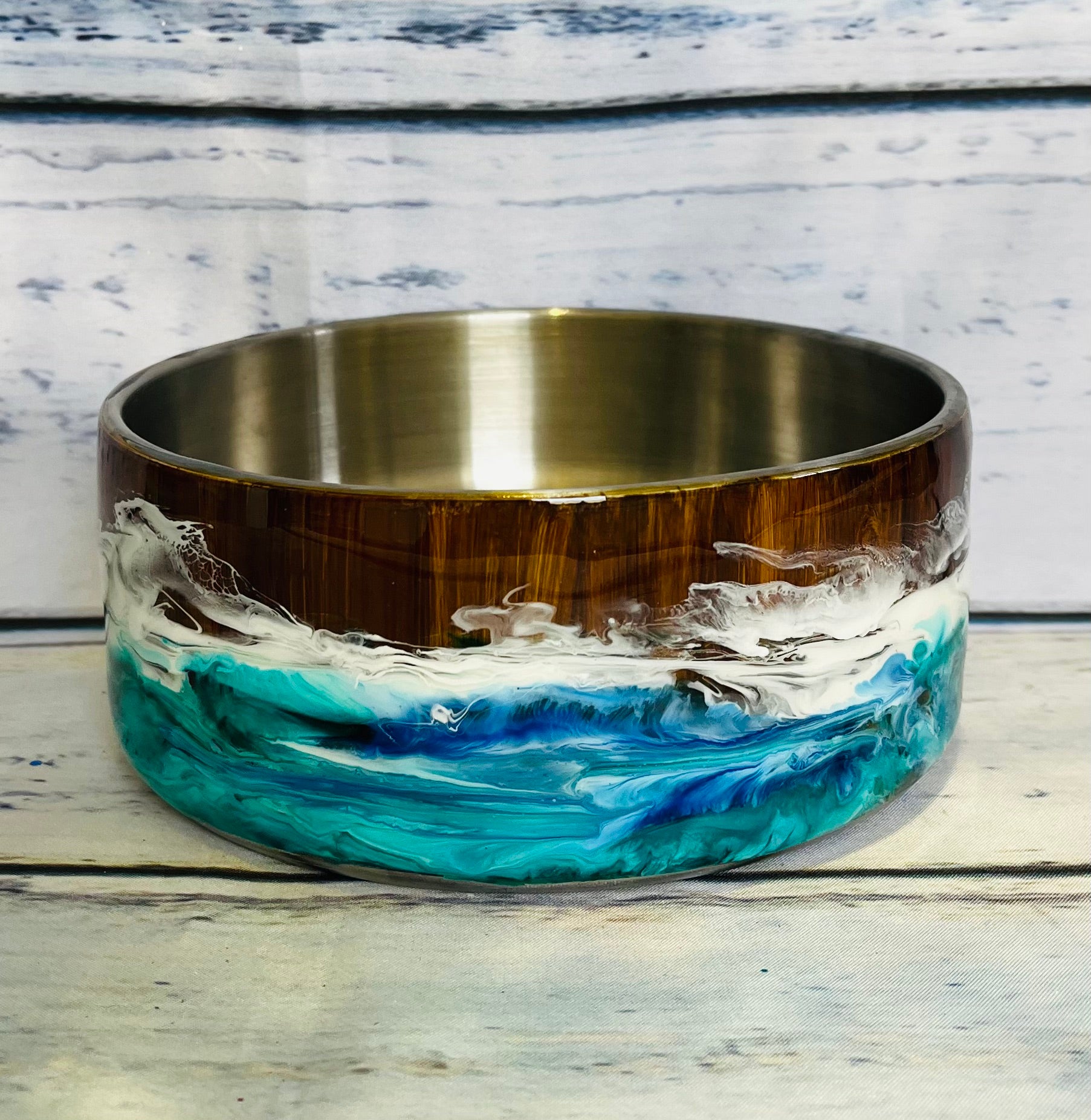 Each bowl is made of double walled insulated stainless steel. Available with dog prints on the beach or plain. It is covered in several layers of epoxy to protect the finish.