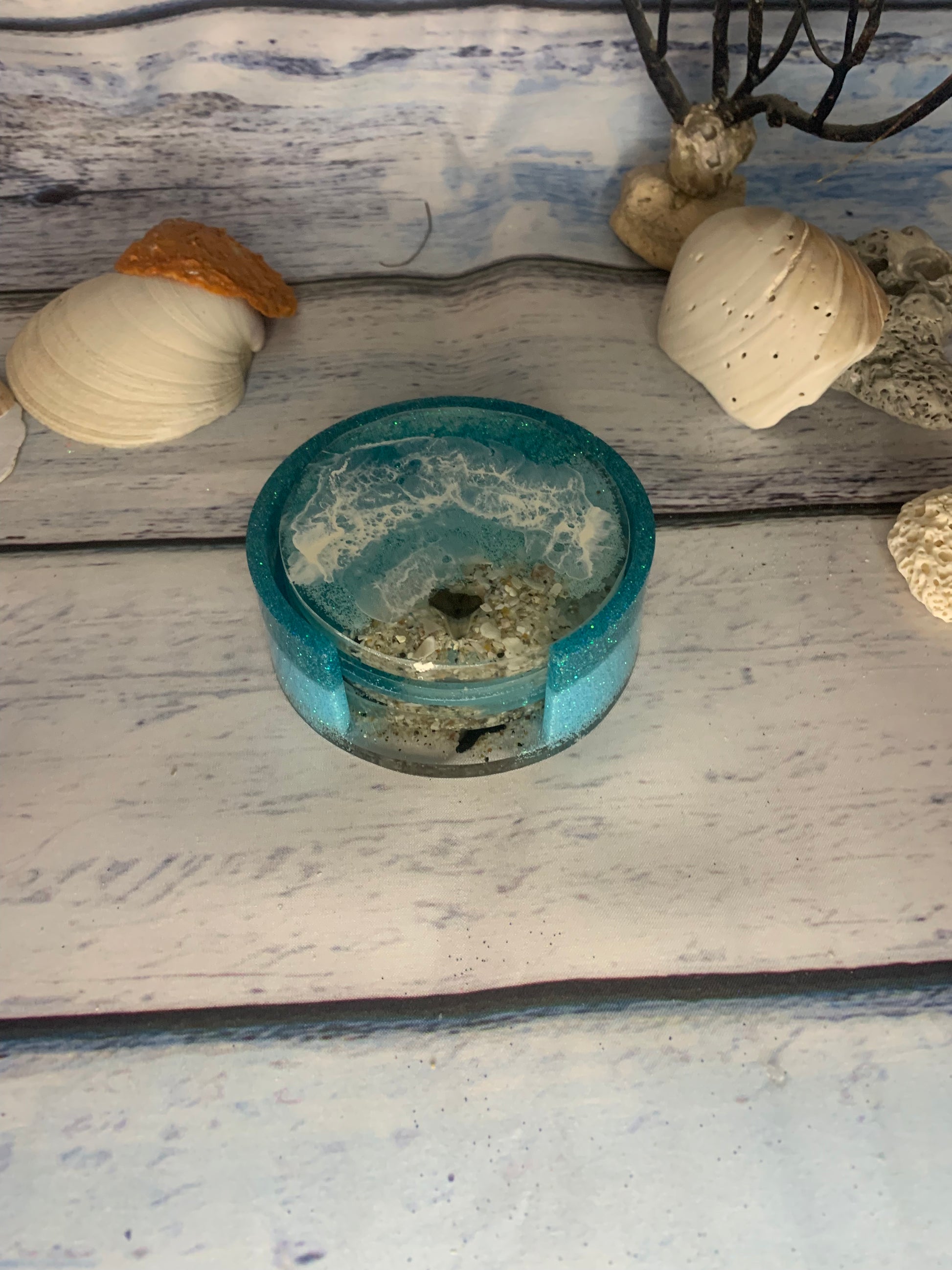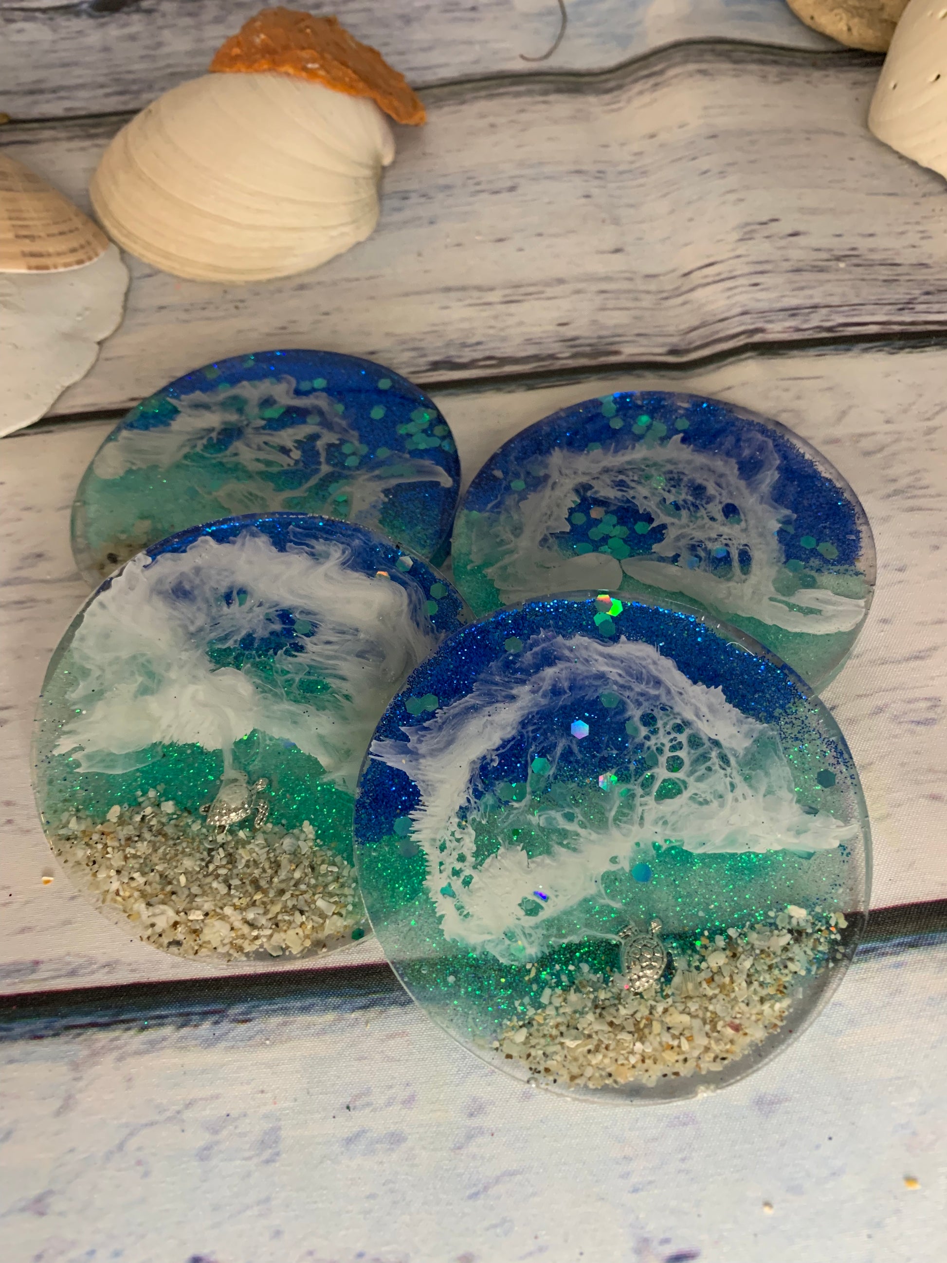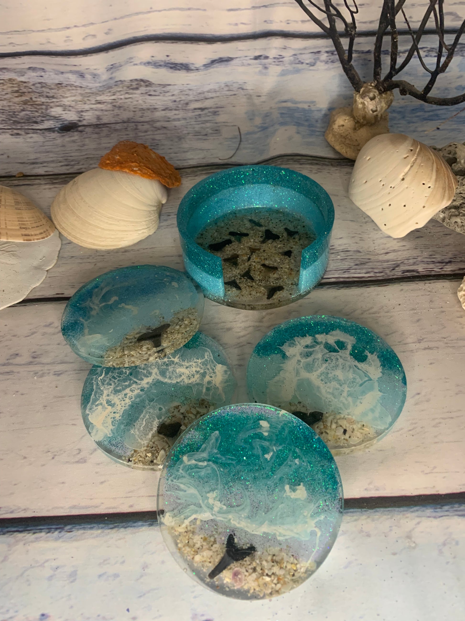 This set includes 4 coasters and an epoxy holder. Each on is beautifully designed like the waves crashing onto the beach.