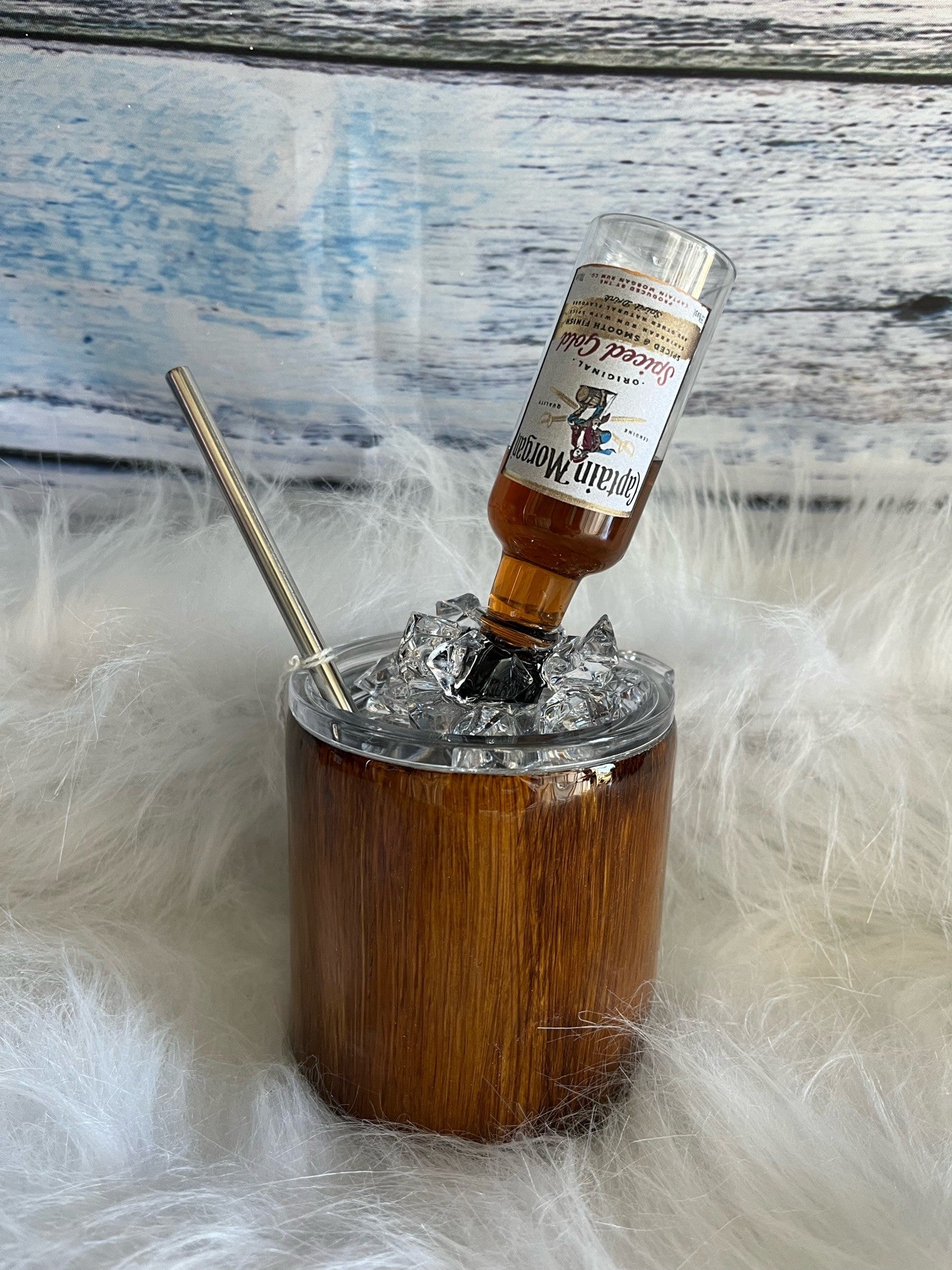 This tumbler takes your drink to the next level with ice and a Capt. Morgan mini bottle on top! Great for taking to a party or to display on your bar. (Mini bottle contains colored water.)