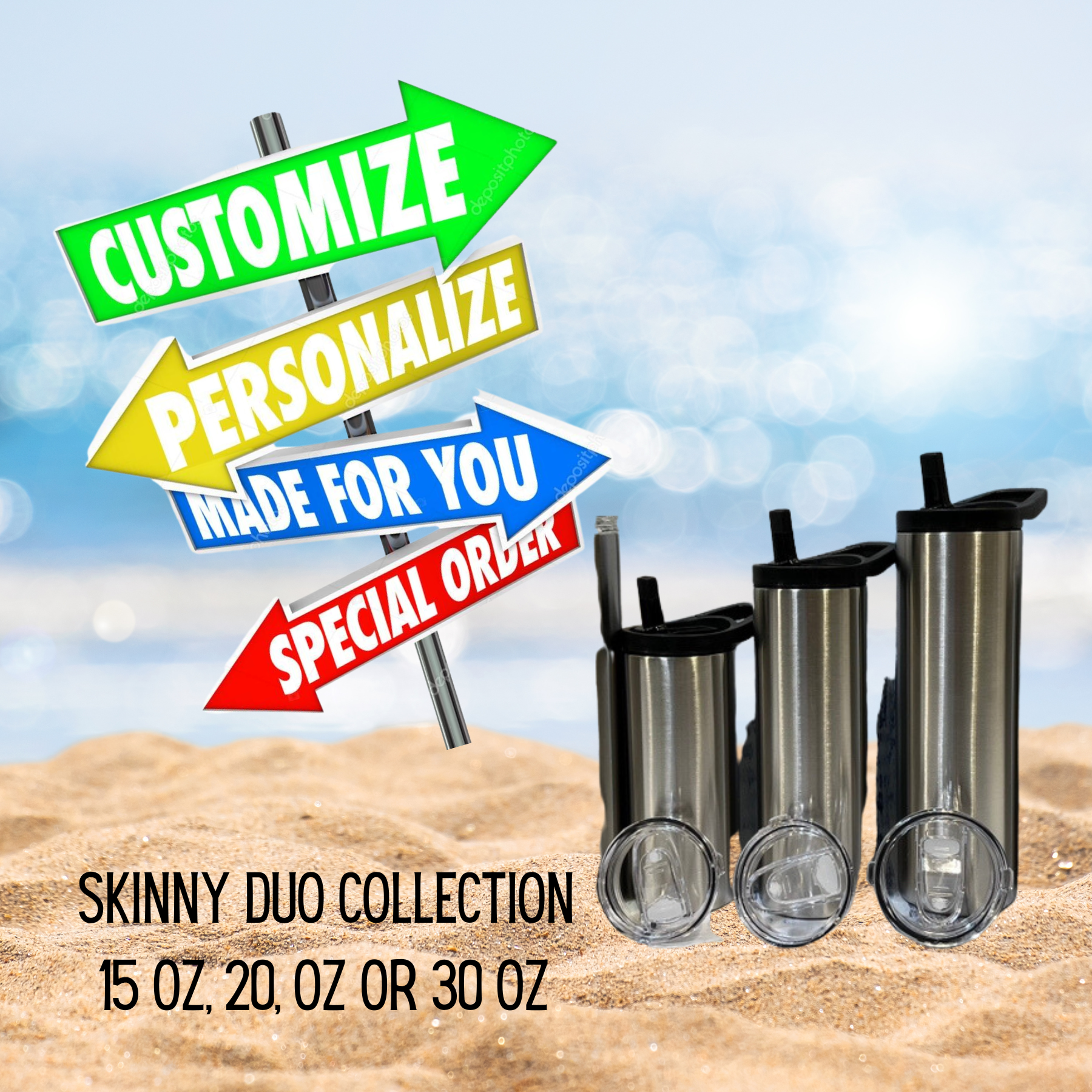 Create the perfect personalized tumbler for your daily drink - design your own Customize Your Own Skinny Duo Tumbler! Just pick your colors and patterns and you'll have the trendiest tumbler around! The possibilities are endless! Zoom zoom, time to get creative!