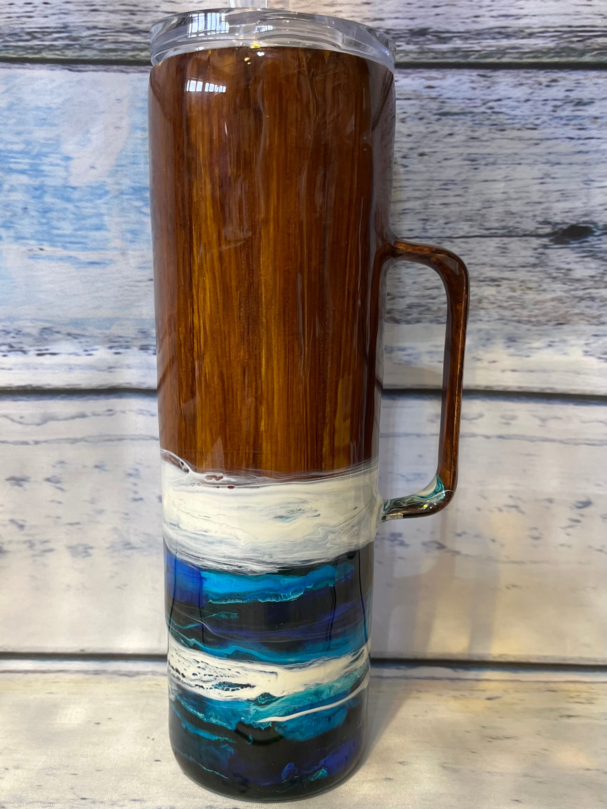 I use HOGG brand double wall, insulated stainless steel tumblers with lids. They will keep beverages hot or cold for a long time. Each tumbler is handmade and unique, not made in a machine. They are finished with several layers of FDA compliant epoxy which gives you a glass like finish. No two tumblers will be exactly alike.