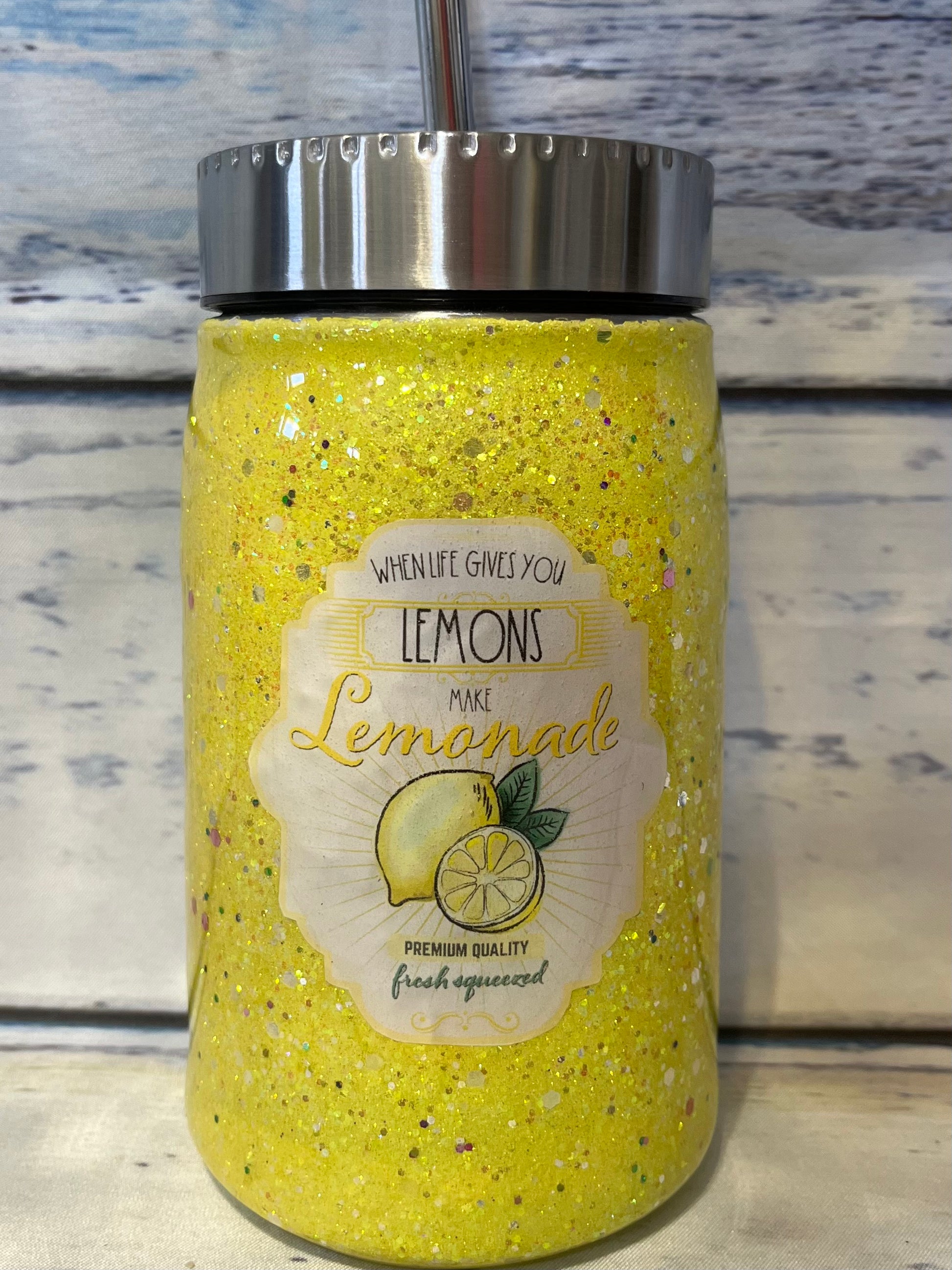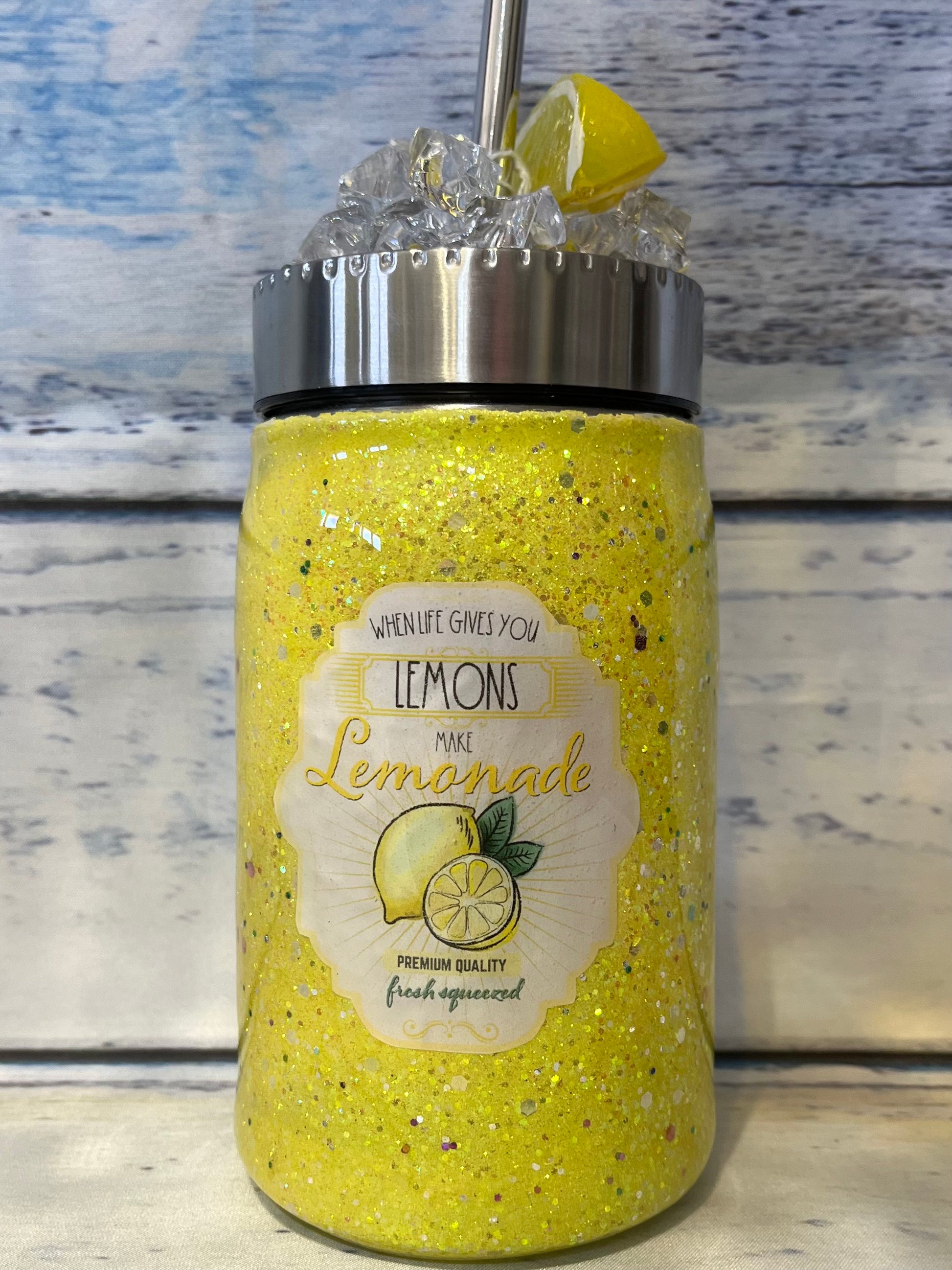 Feel the sweet and sour vibes, with this "When life give you lemons Make lemonade mason glitter epoxy tumbler!" Get your daily dose of sparkle and sunshine, with this one of a kind tumbler. Totes adorbs and totally un-lemon-able! 🍋