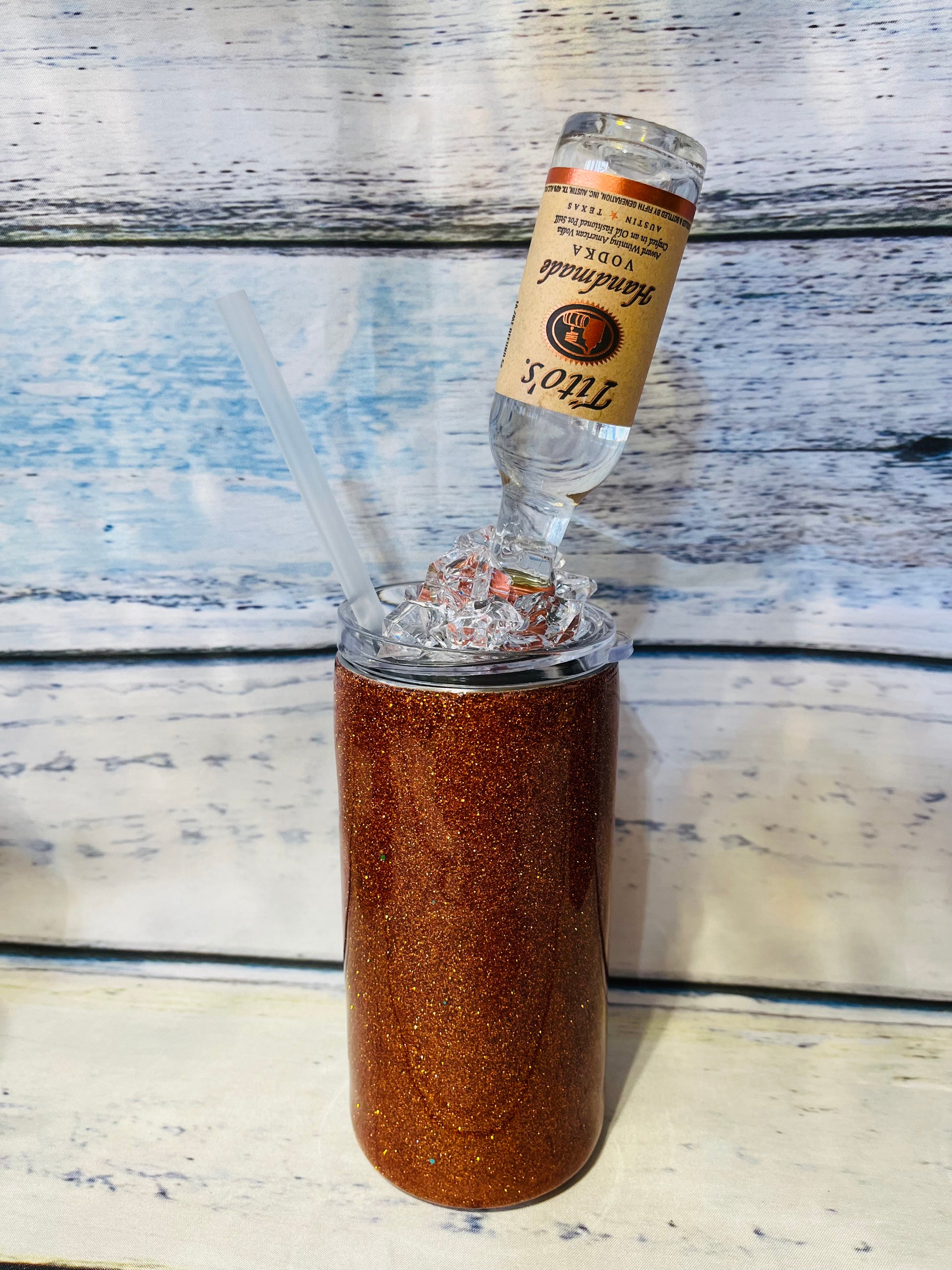 This tumbler takes your drink to the next level with ice and a Tito's mini bottle on top! Great for taking to a party or to display on your bar. (Mini bottle contains colored water.)