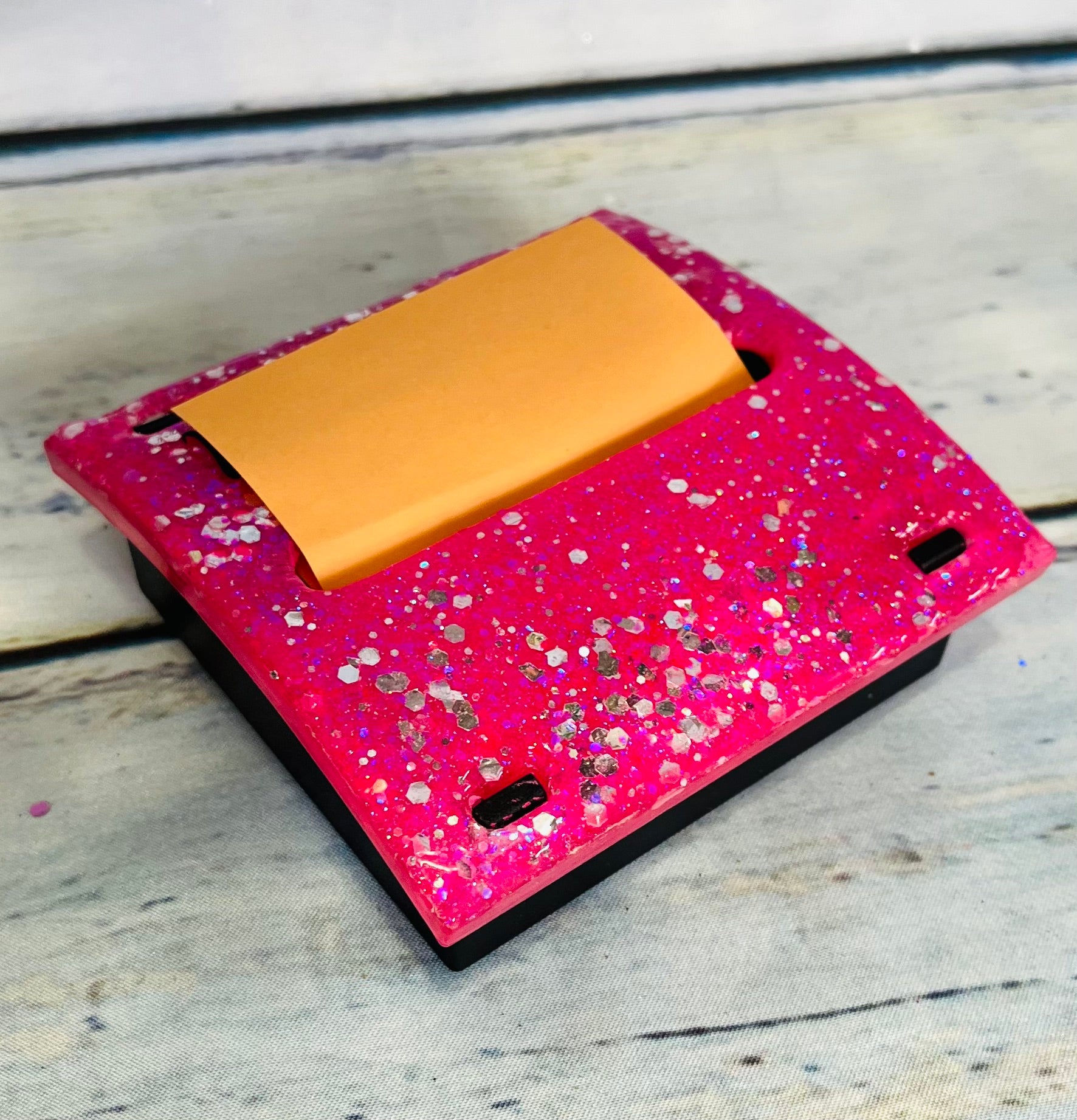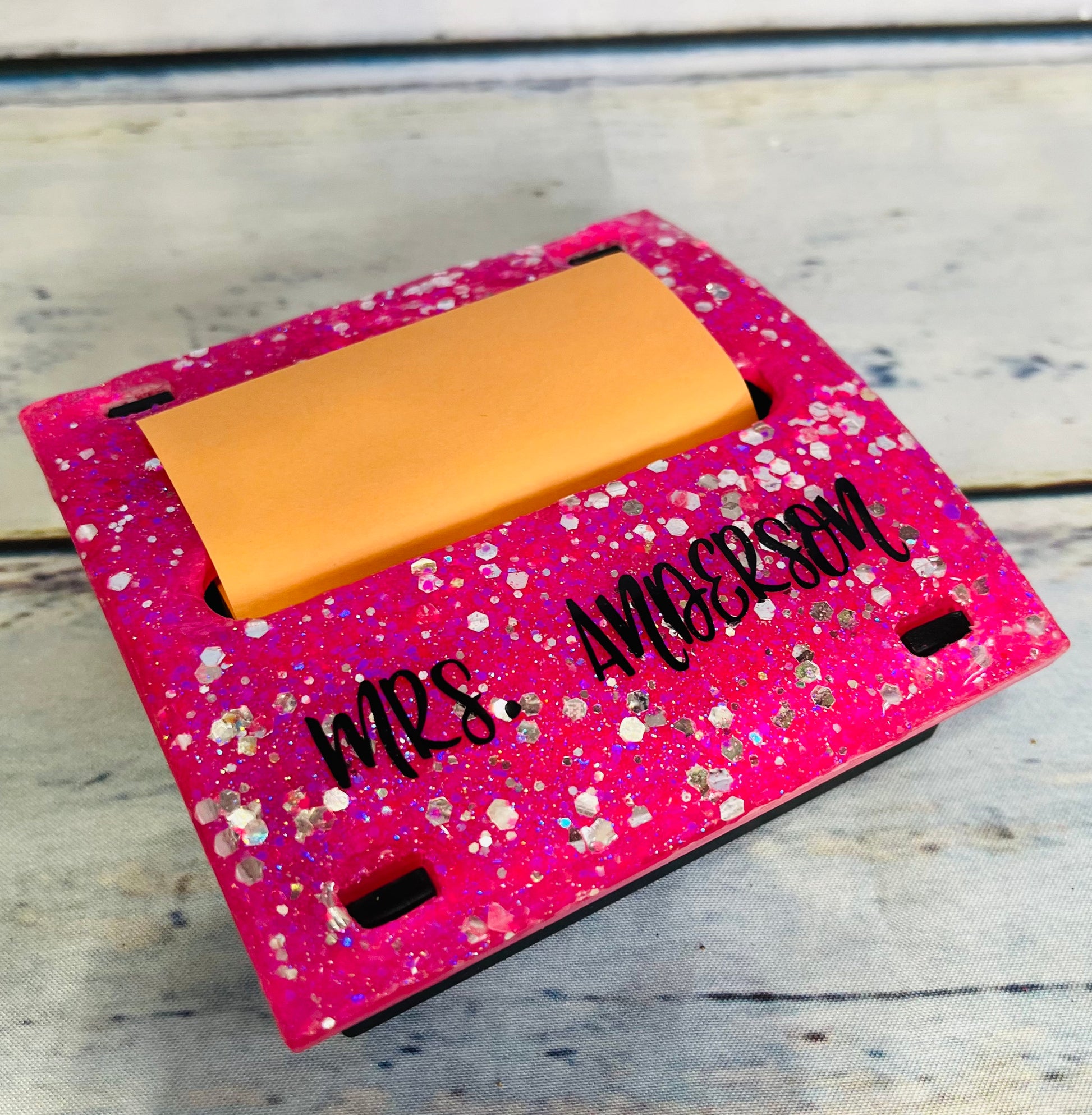 Say goodbye to boring desk décor with this custom glitter epoxy note dispenser! This sticky-noted savior is the perfect way to add some sparkle to your workspace. Personalize it with your favorite glittery epoxy – stick it and slay it! 💃