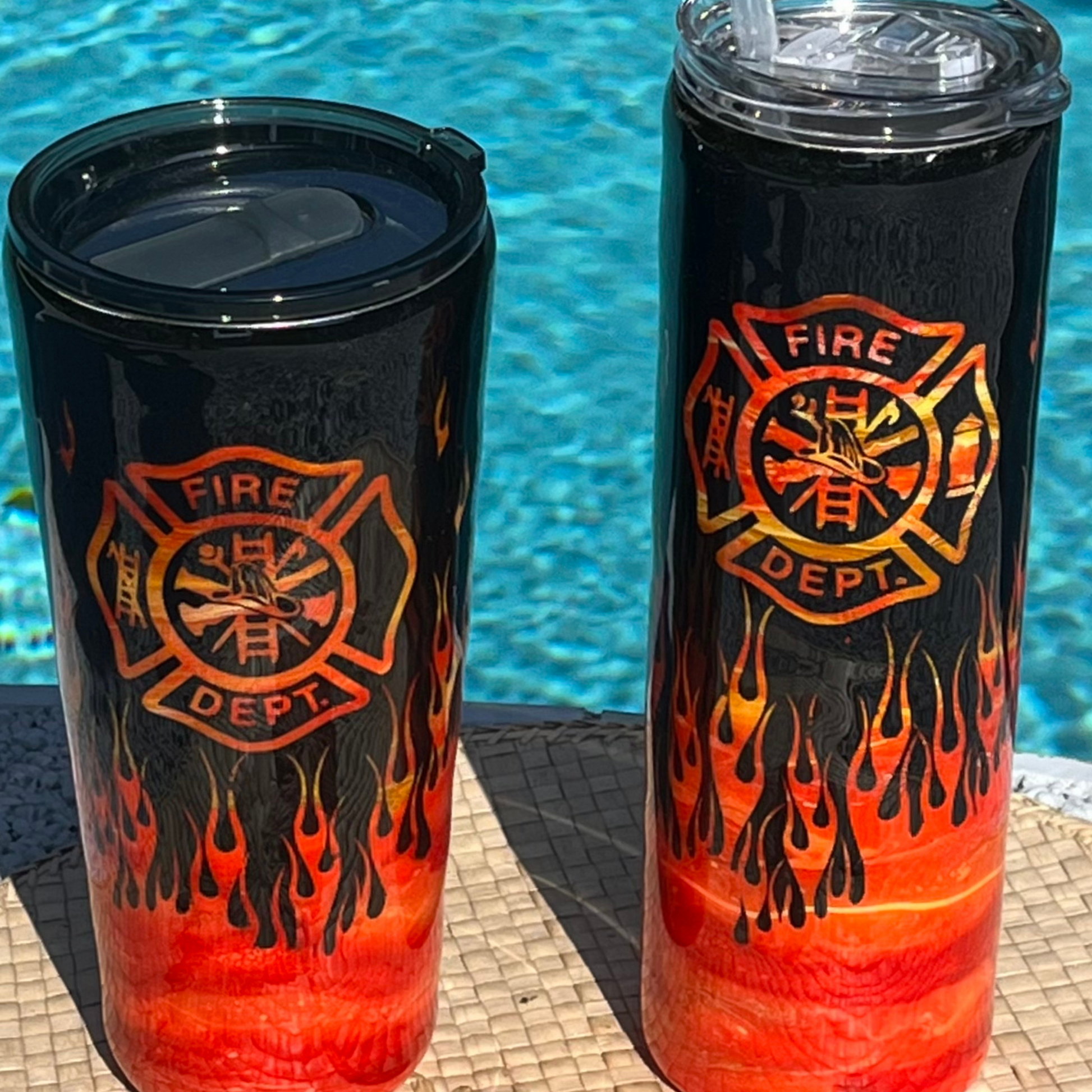 Bring the heat with this firefighter with flames epoxy tumbler! Show your support for our firefighters and sip your favorite beverage in sizzling style. Perfect for impressing and keeping your drinks cooler for longer - you'll be a real hero!