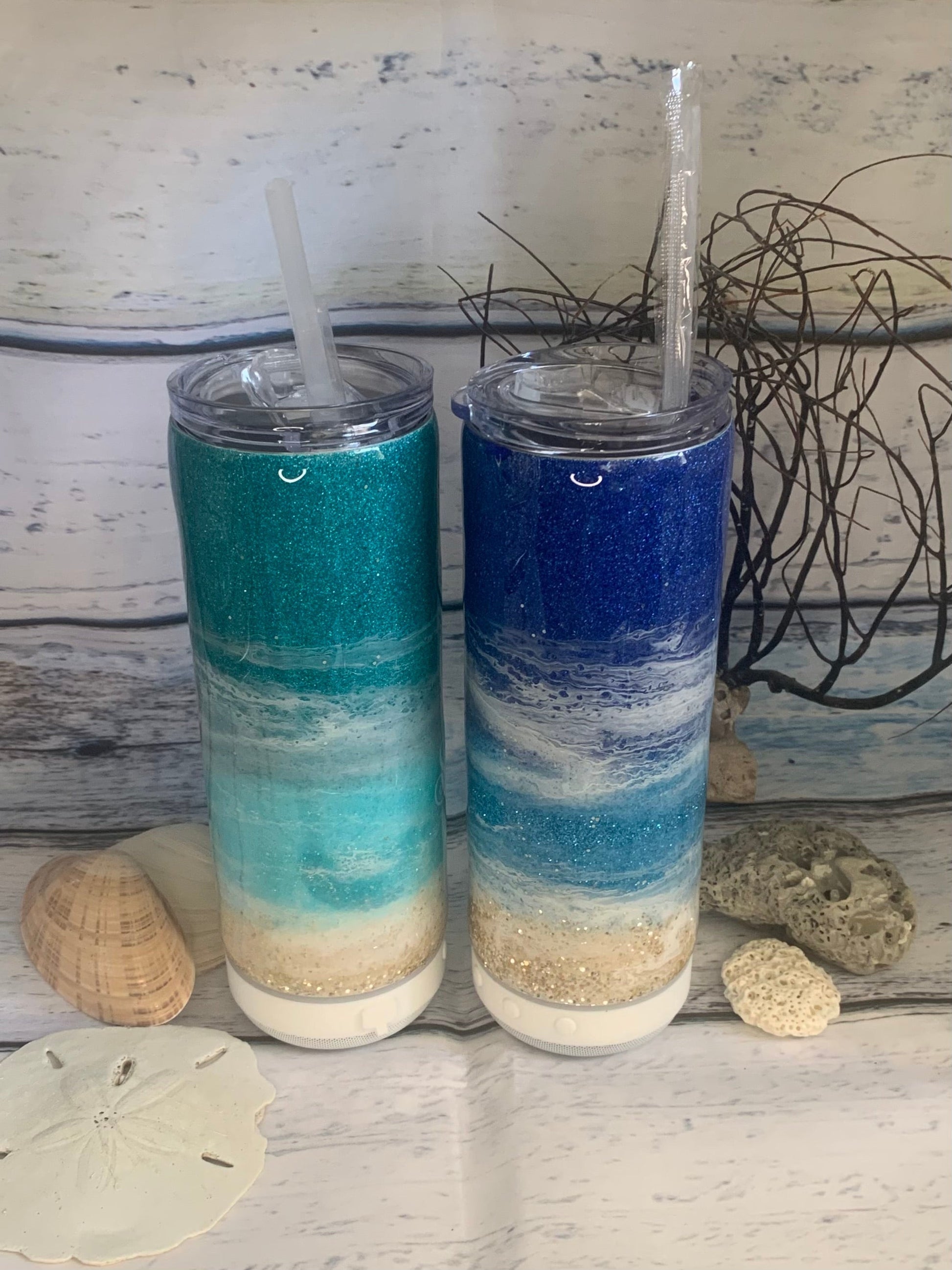 These beach tumblers are available in the teal glitters and blue glitters. Examples of each are in the photos listed.