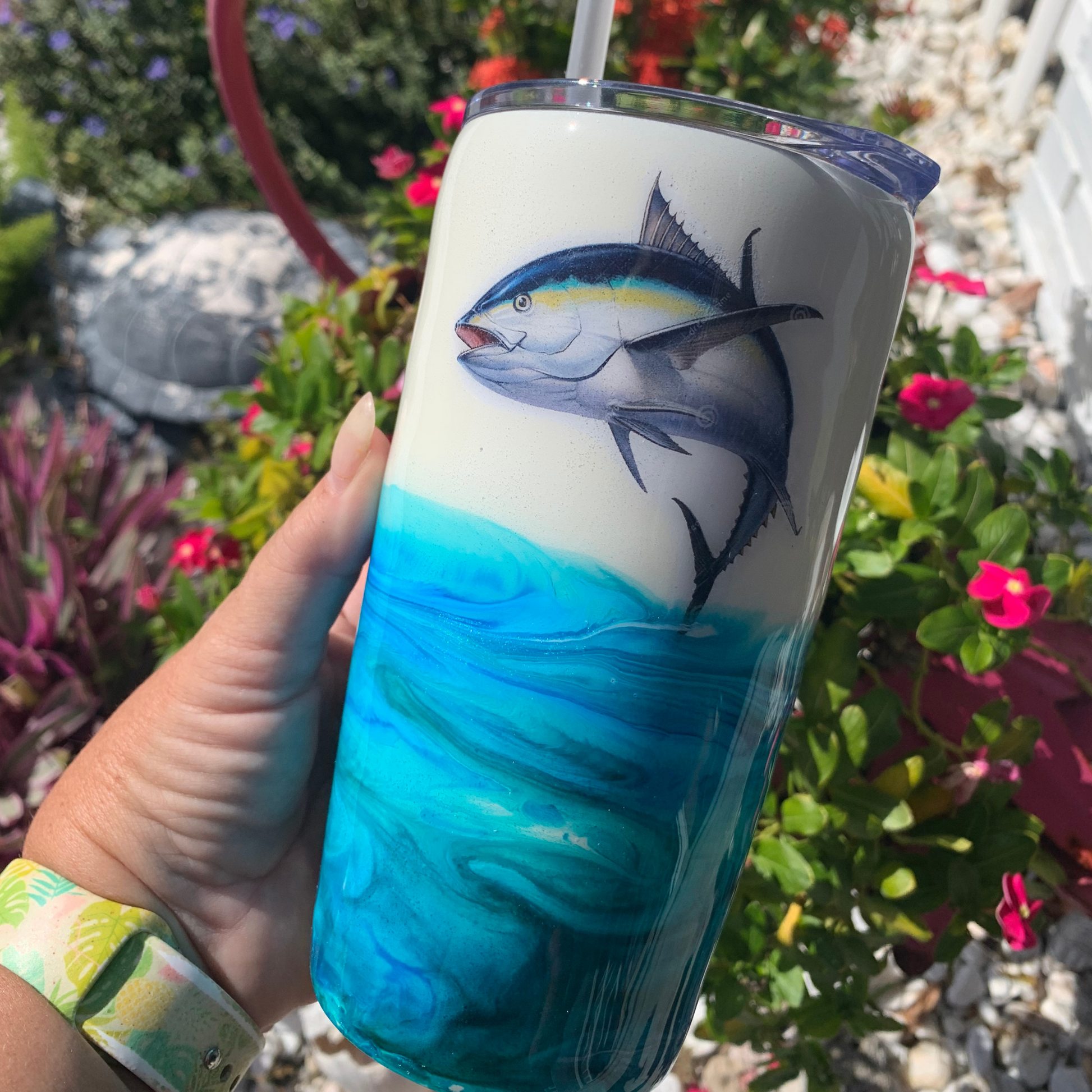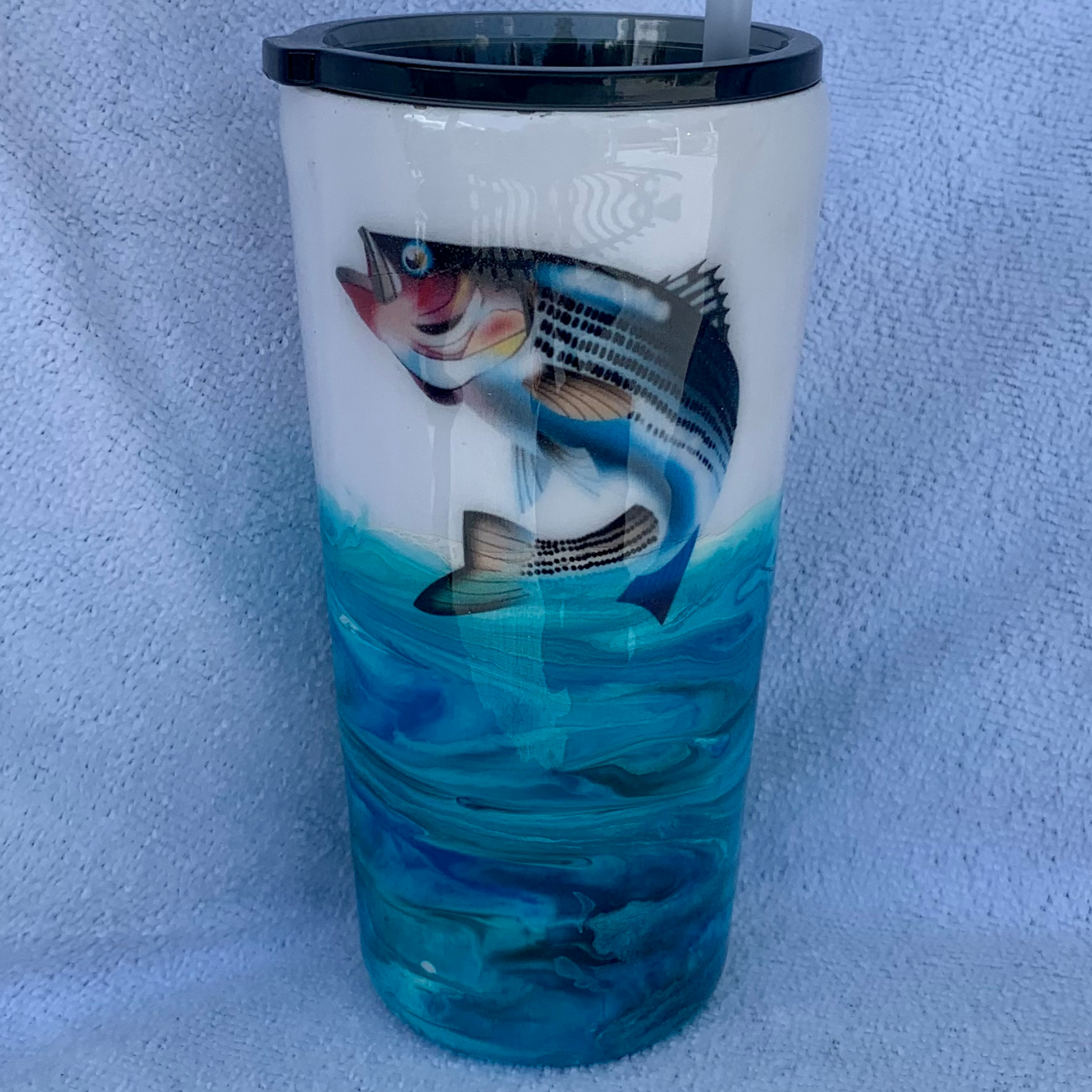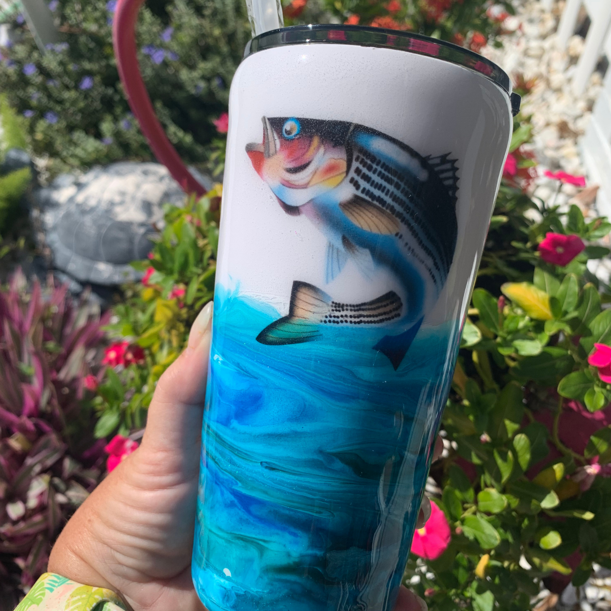 Catch yourself a conversation starter! This fish jumping out of water epoxy tumbler is sure to snag an eye or two fishermen wherever you go. Not to mention, you'll be sipping in style with this unique and fun cup. Reel it in!