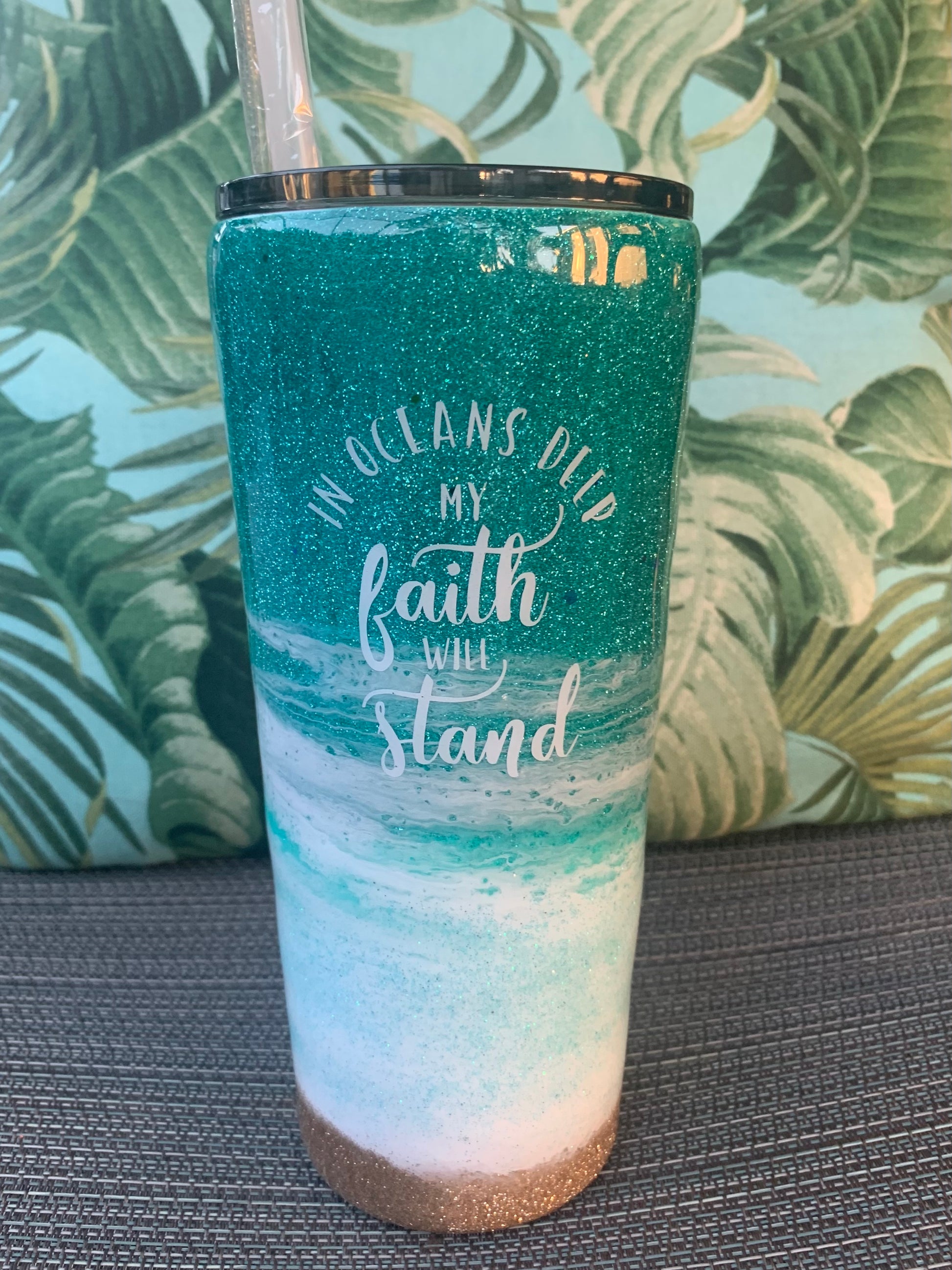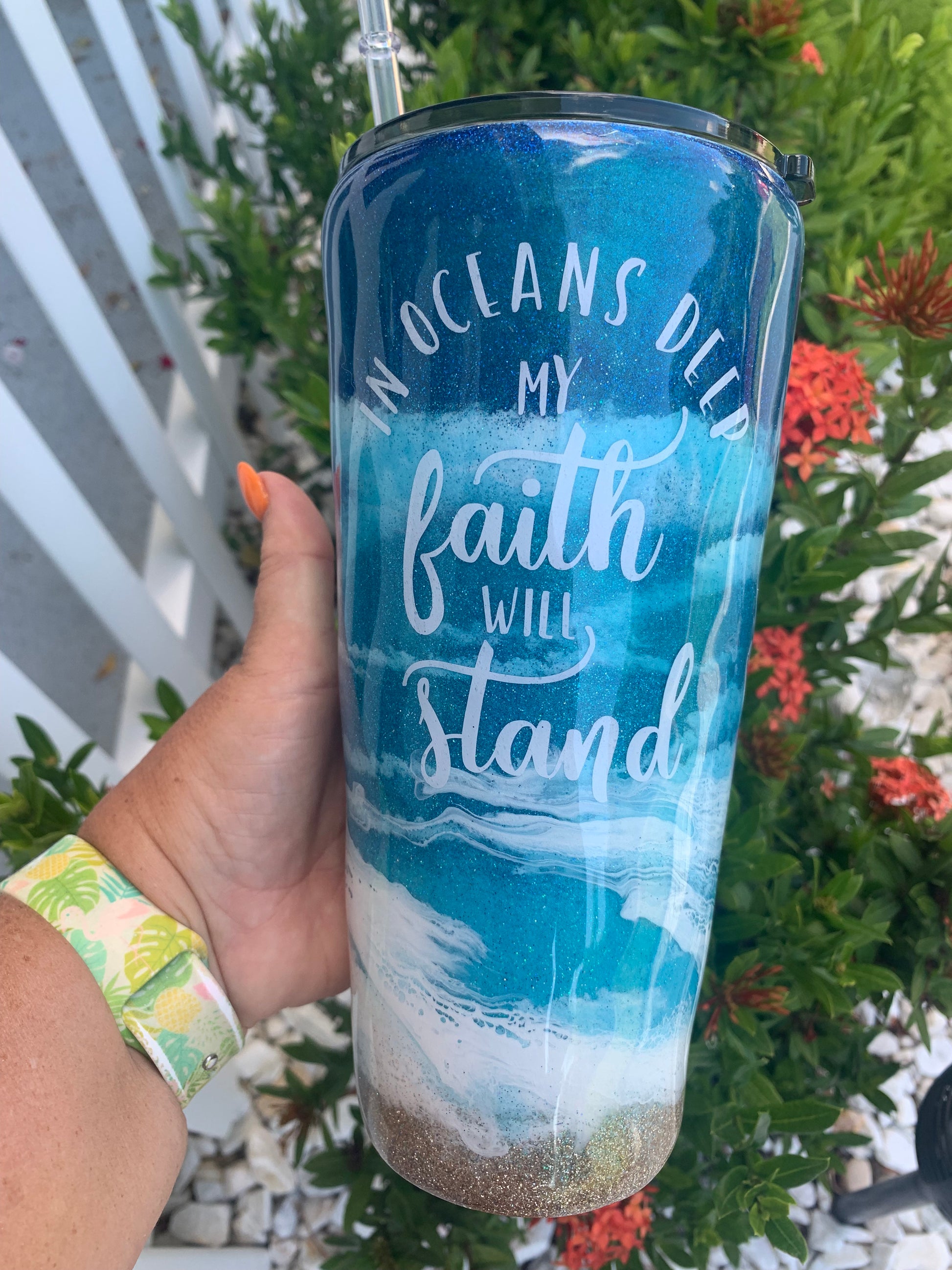 Keep your faith afloat with this stylish and durable In Oceans Deep My Faith Will Stand tumbler crafted with eye-catching epoxy. Perfect for your morning coffee, this tumbler will keep your faith afloat!