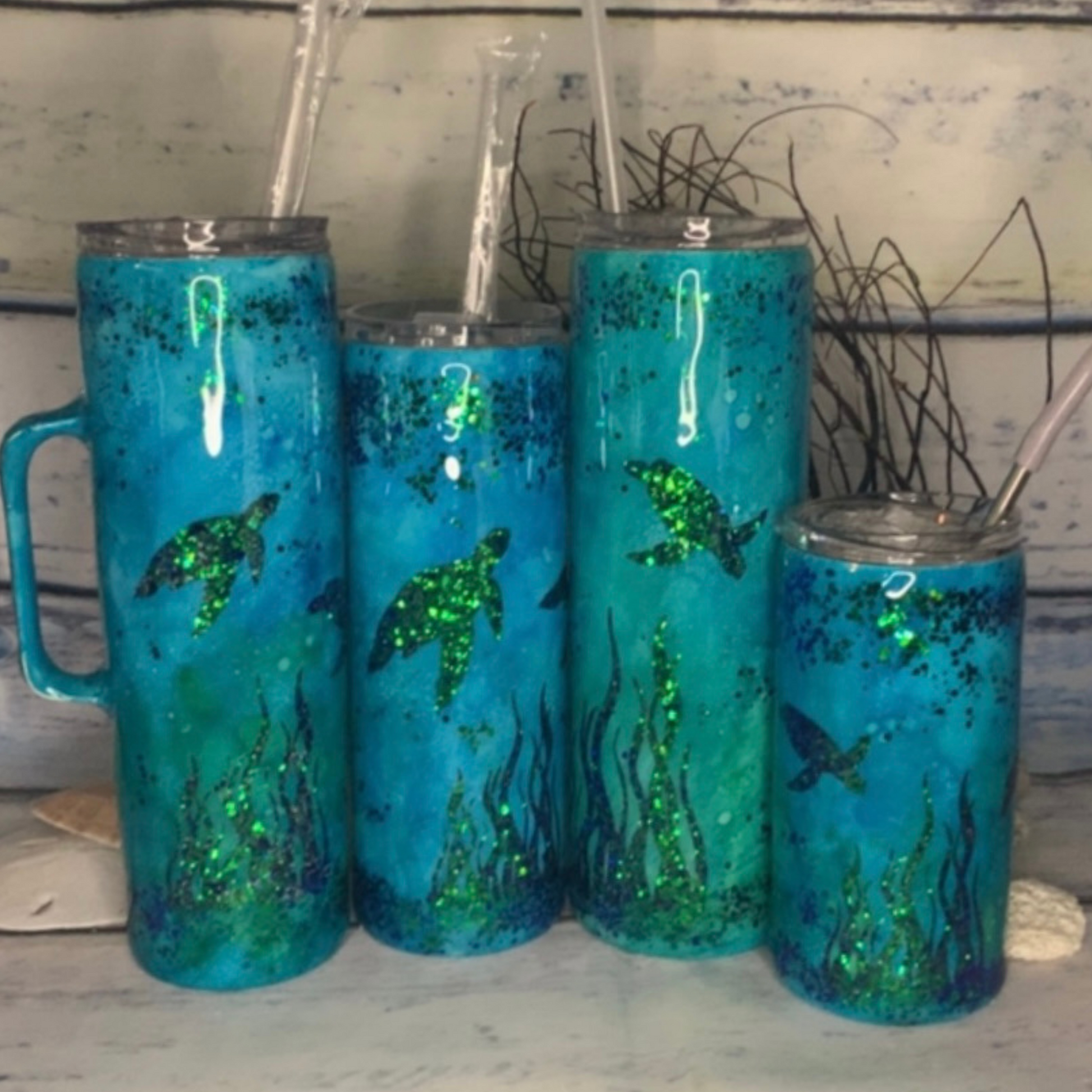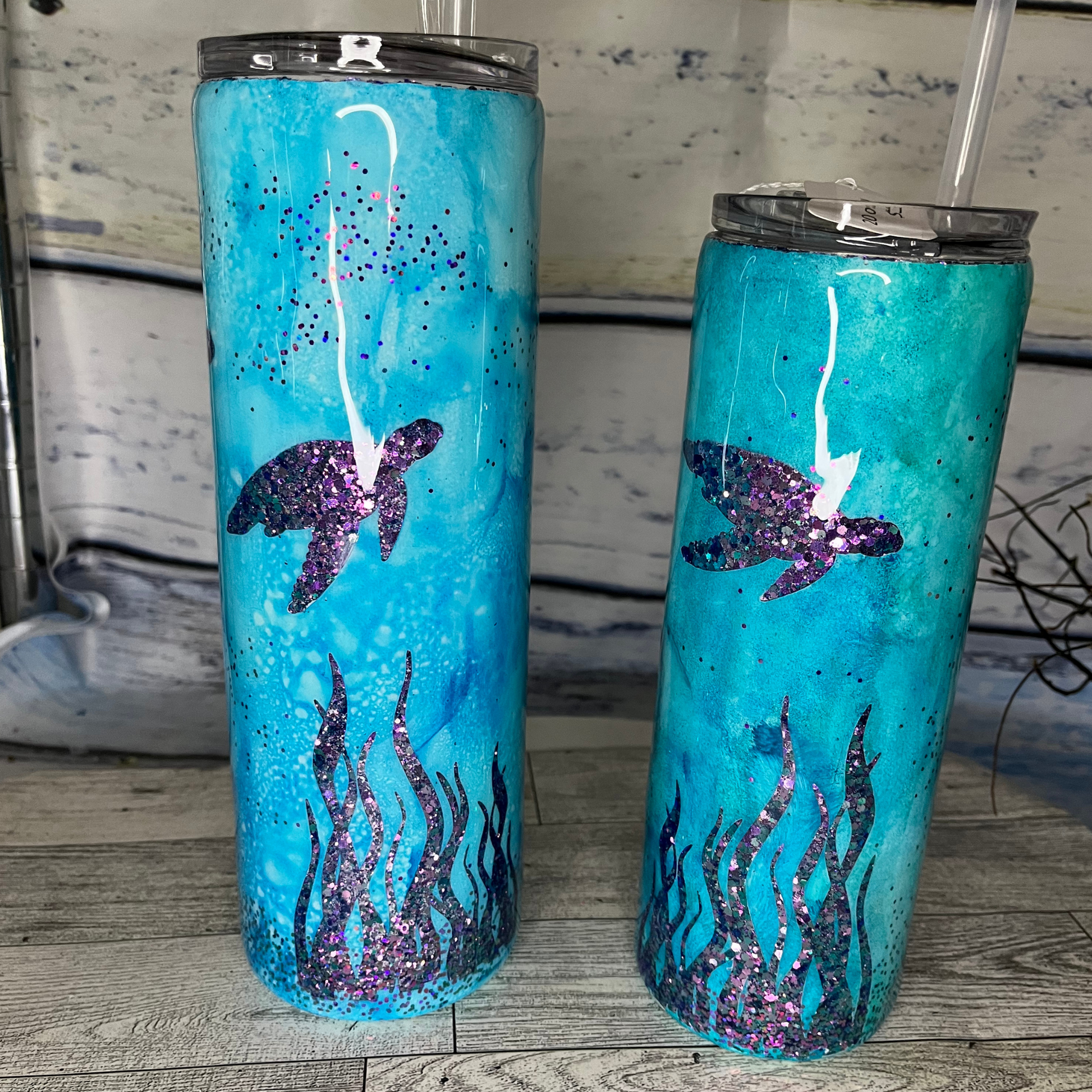 Don't hide your love for sea turtles any more! Show off your passion with this gorgeous glittery Sea Turtle "Peek-A-Boo" epoxy tumbler. It'll be sure to make a splash!