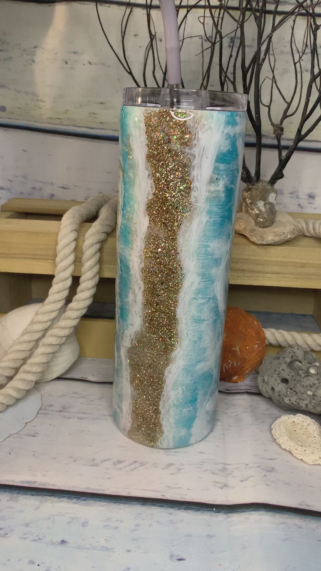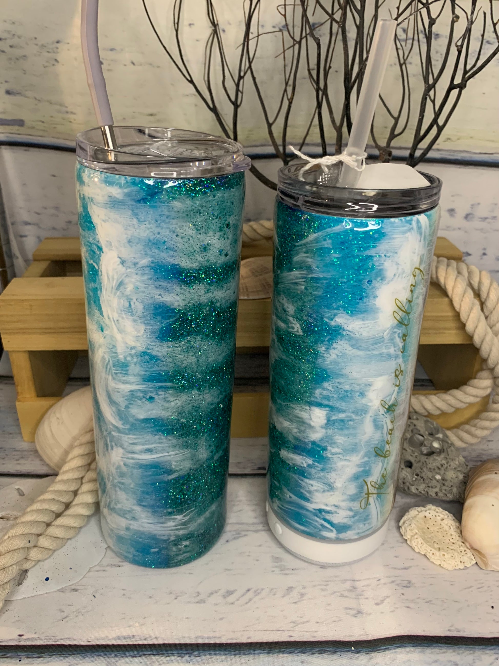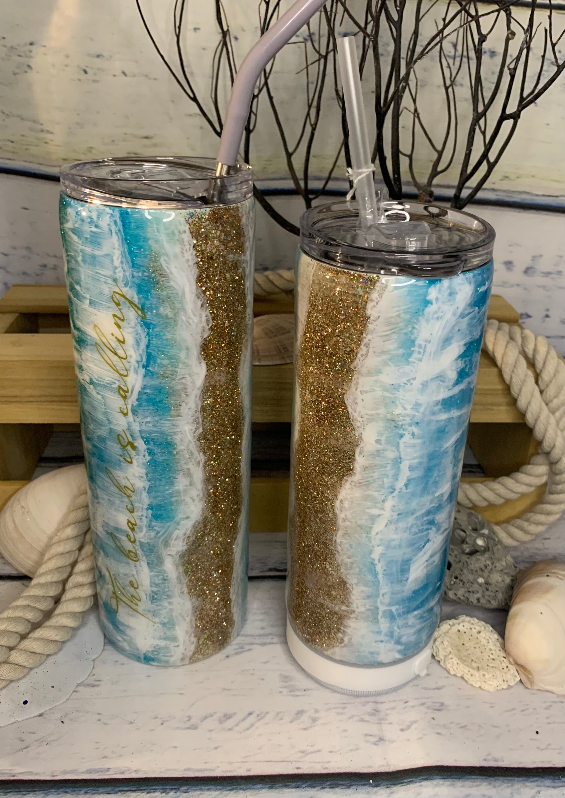 Are you struggling to hear the siren call of the sea? Look no further than this sparkling Glitter Beach epoxy tumbler! You'll be ready to catch some waves and some rays with this eye-catching piece. So grab your sunscreen, and let the glittery seas part! Ready, set, hit the beach!